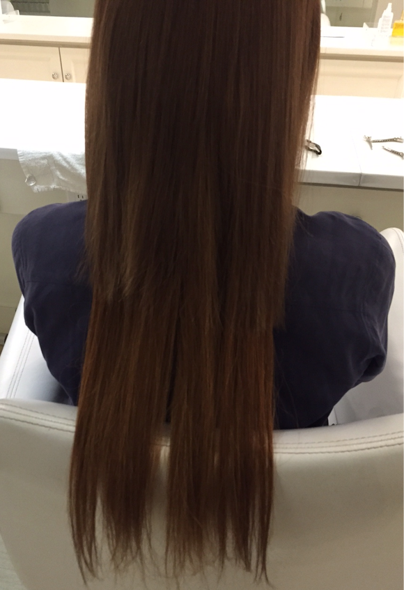 shouldn’t be washed for 48-72 hours after the extensions were applied. Once my hair was blown dry and since the extensions were for volume, I had half of a set (six pieces) applied strategically to the under layers in the back of my head for a natural boost that wasn’t too dramatic. Next, the extensions were trimmed to my hair length, and I was fully styled to look the height of glamour.