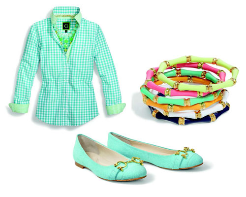 CaptionGingham Striped-Trim Shirt $68, Bling Bib Necklace $128, Enamel Bamboo Embossed bracelet $28 each, and Embossed Leather Logo ballet flat $98