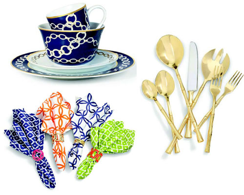 Status Chain Link salad plate $14, Status Chain Link soup bowl $14, Status Chain Link cup $12, Bamboo handle flatware - 5 pc place setting $48, Bamboo salad servers (set of 2) $44, Printed cotton Poplin Ikat napkins (set of 4) $34 and Rectangle link napkin ring (set of 4) $58