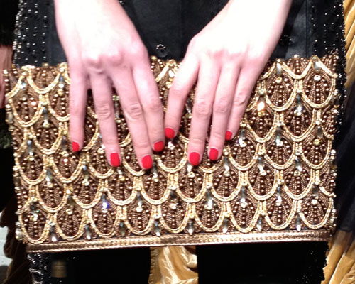 The Nail Inspiration: Wanting to capture 1970s disco, New York inspired nails, Deborah Lippmann created a unique pink color called “Zing Pink,” a combo of three hues with a pyramid stud placed on each nail (Kate Spade’s signature clasp closure), as well as an all black nail using her shade Fade to Black from the Debra Lippman Collection.