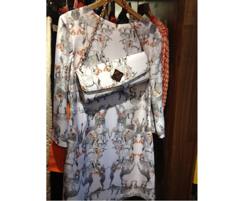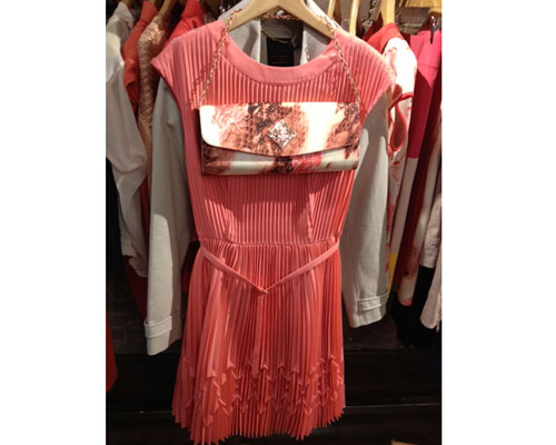 But the collection also incorporated many updated, contemporary components including conversational patterns, vivid colors, and great hardware accents. Ted Baker London’s artful use of pleats seen throughout the collection on dresses and tops married a sophisticated and playful tone to the lineup. All of these pieces, whether it be the rainbow window dress or the safari clutch, have such personality that they make a statement all its own.
