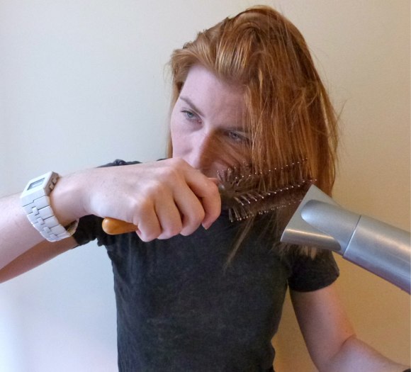 I wrap larger sections of hair around the brush, and move around my head in a counter-clockwise formation to smooth and move the ends under. I wind the brush down, and pause at the ends for added emphasis and curl. From all that mousse, the hair can have a very cool, slightly tacky, textured quality, which looks great once the hair is dry, but also requires to move a bit more slowly with a round brush.